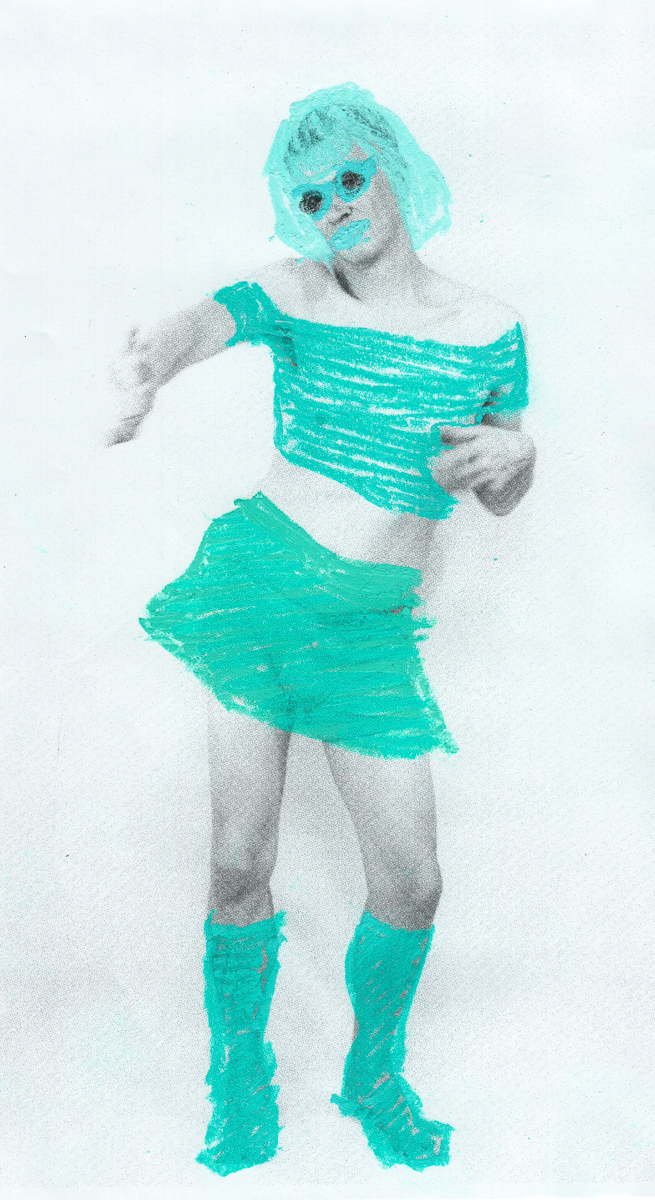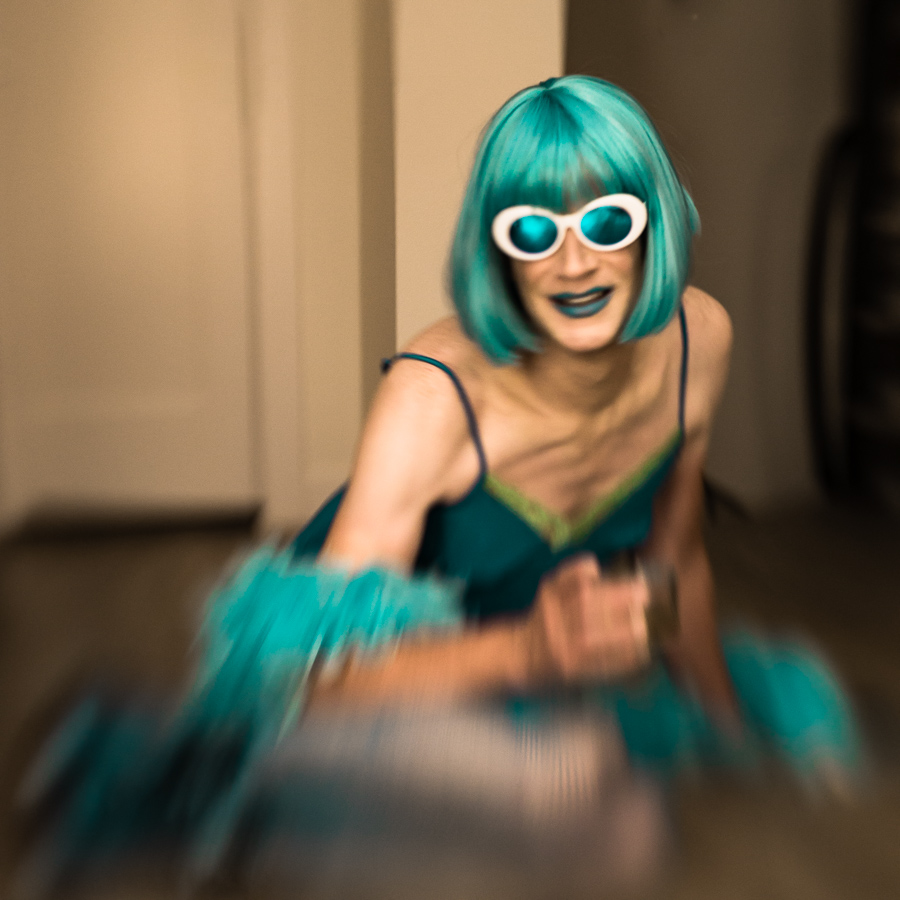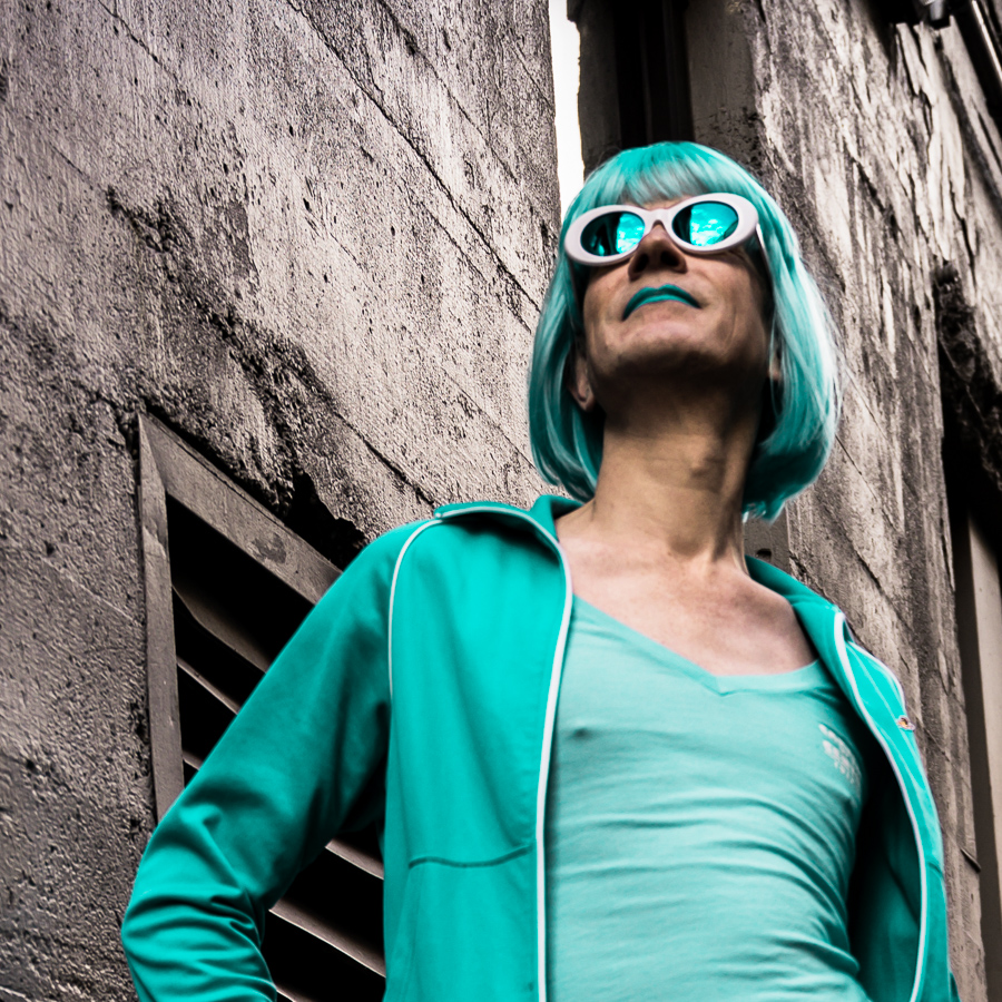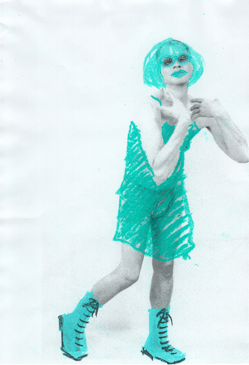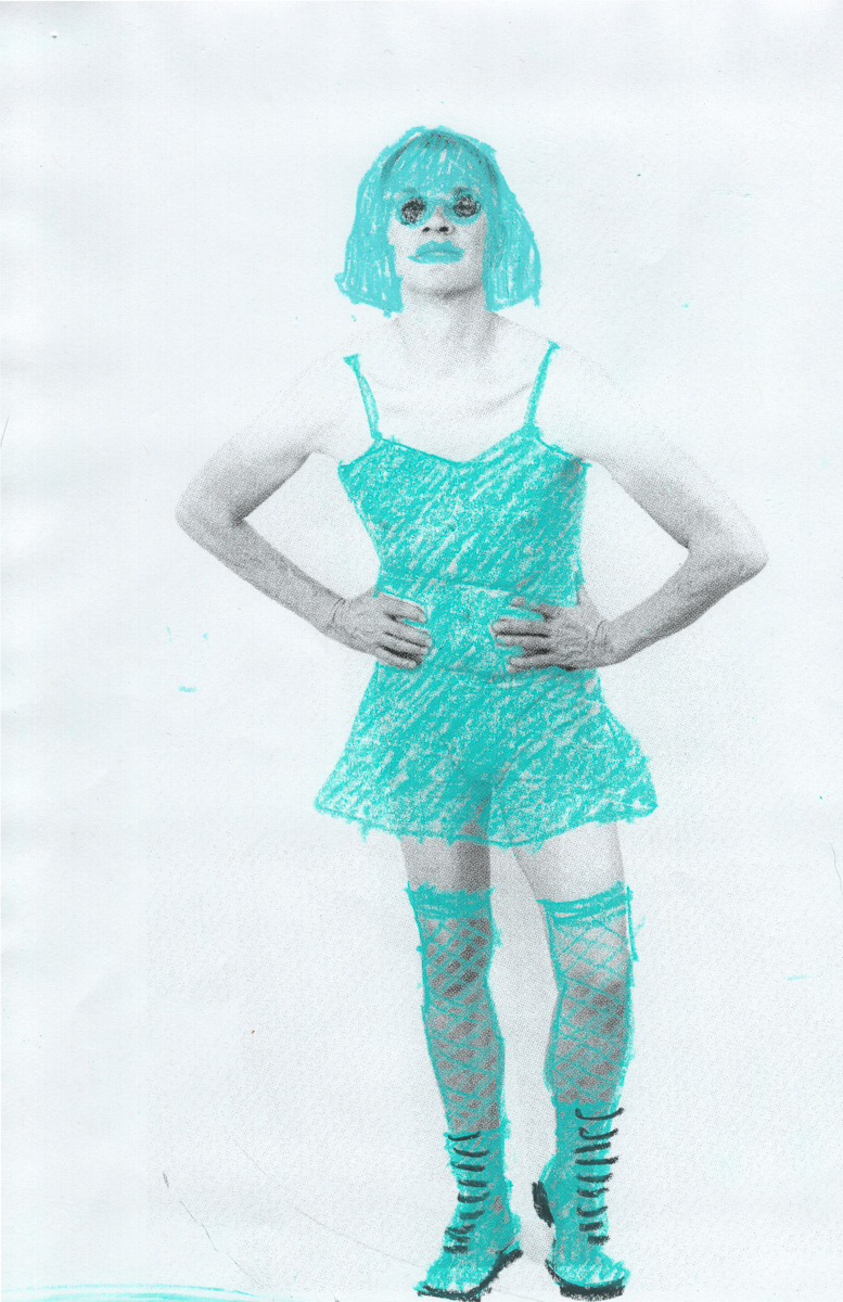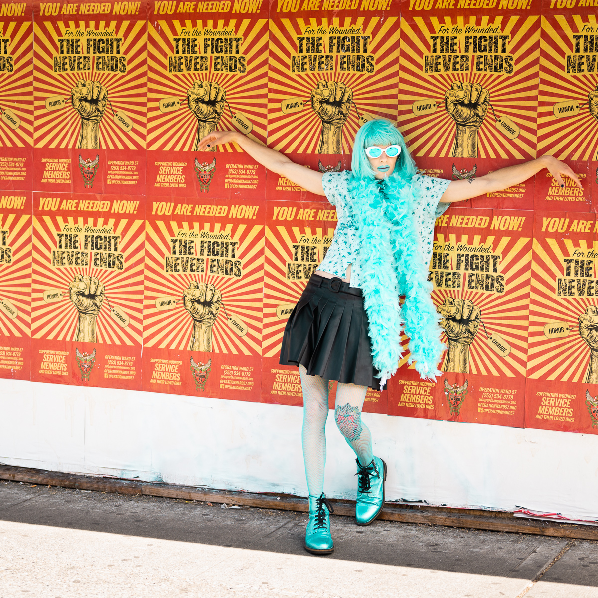 The Holly Terror Project revolves around a drag character I created in the ’90s. Holly is clad in aqua blue from the pageboy wig atop her head all the way down to her army boots. She draws inspiration from influences ranging from Andy Warhol’s Factory scene and the punk rock Riot Grrrls of the ‘90s to the broader queer culture.
