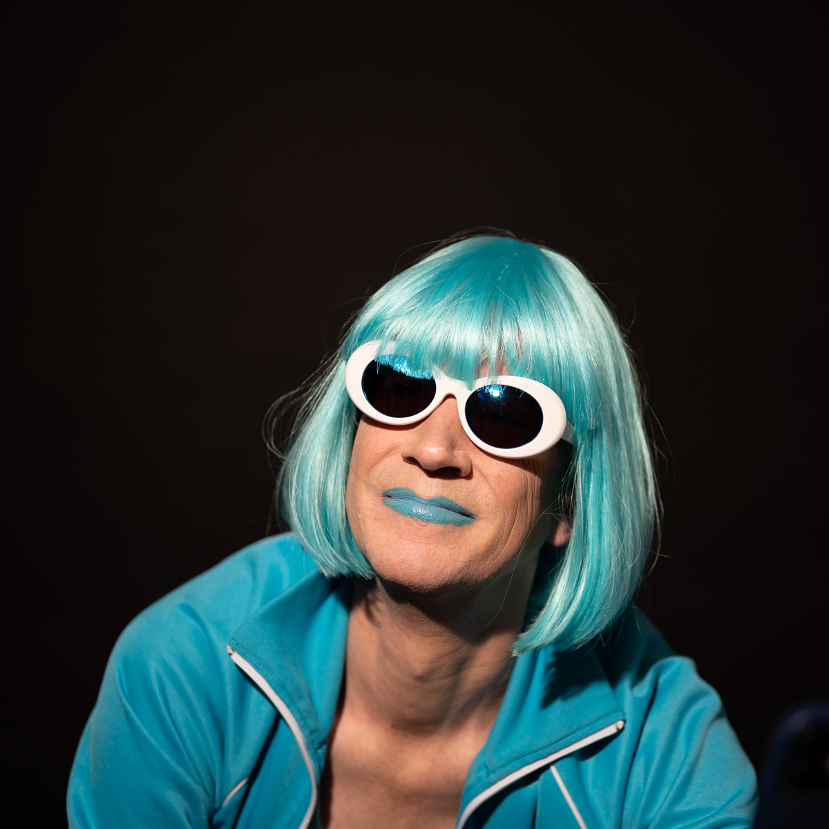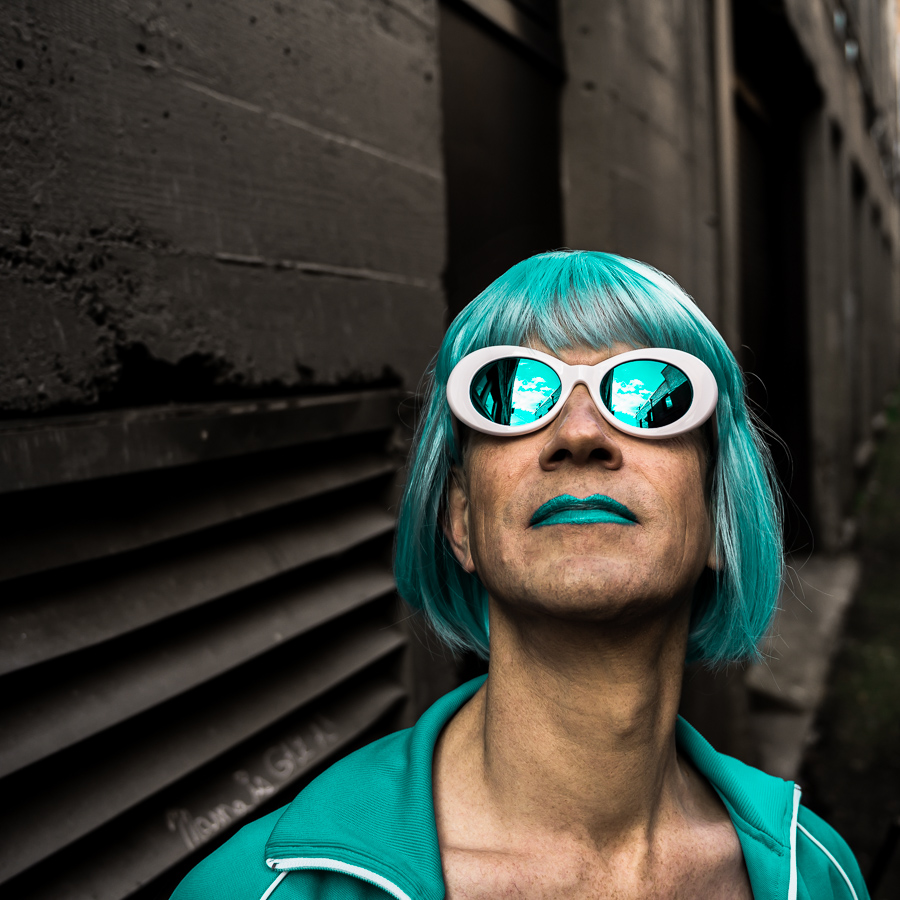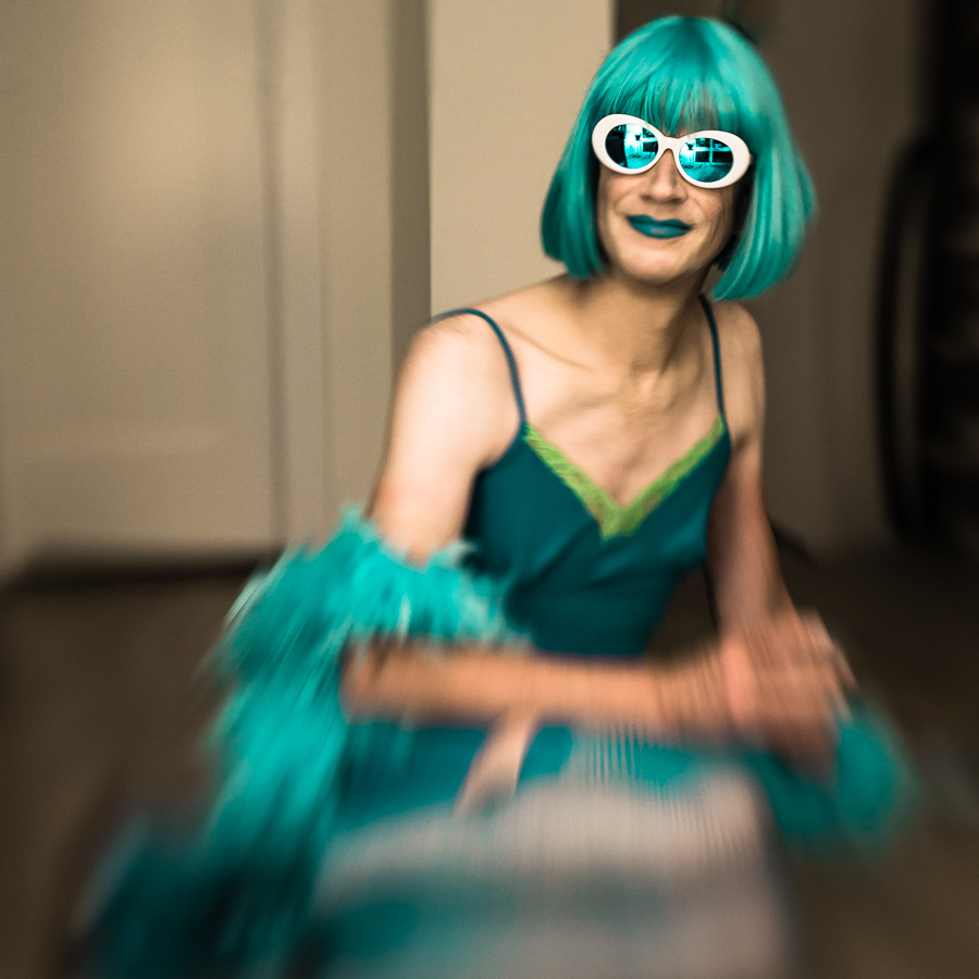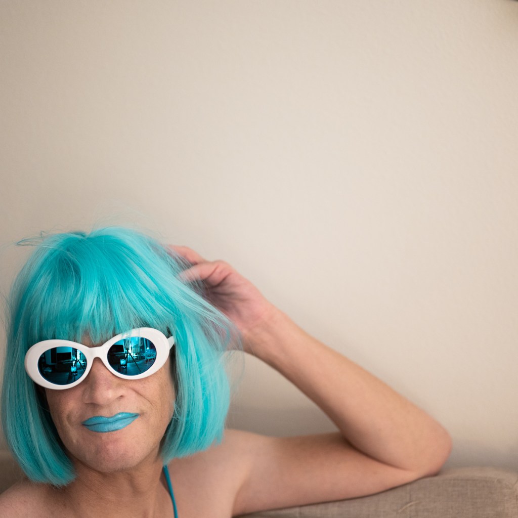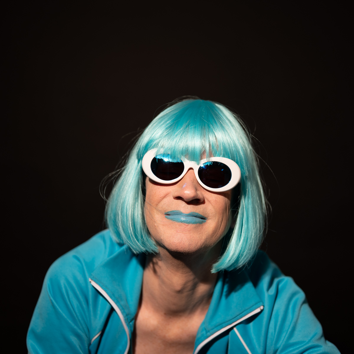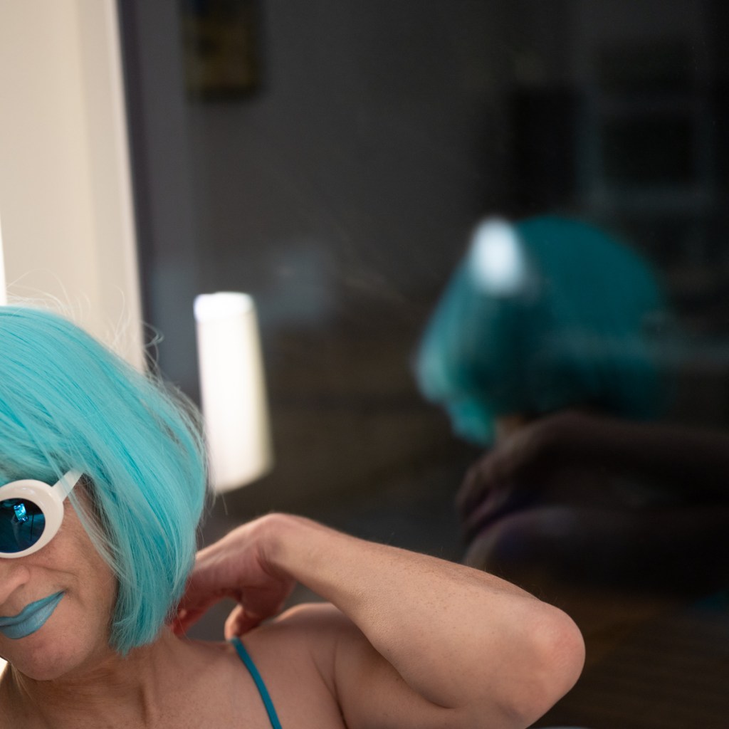 The Holly Terror Project revolves around a drag character I created in the ’90s. Holly is clad in aqua blue from the pageboy wig atop her head all the way down to her army boots. She draws inspiration from influences ranging from Andy Warhol’s Factory scene and the punk rock Riot Grrrls of the ‘90s to the broader queer culture.
