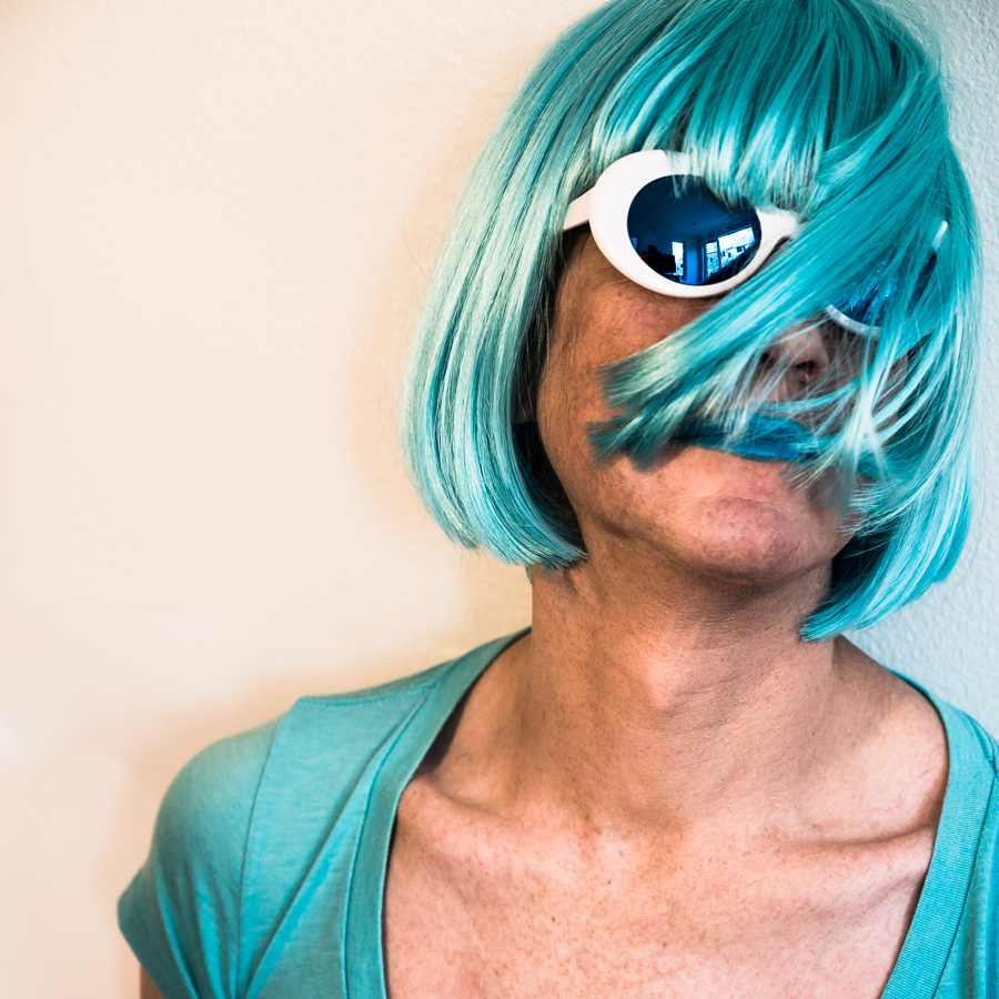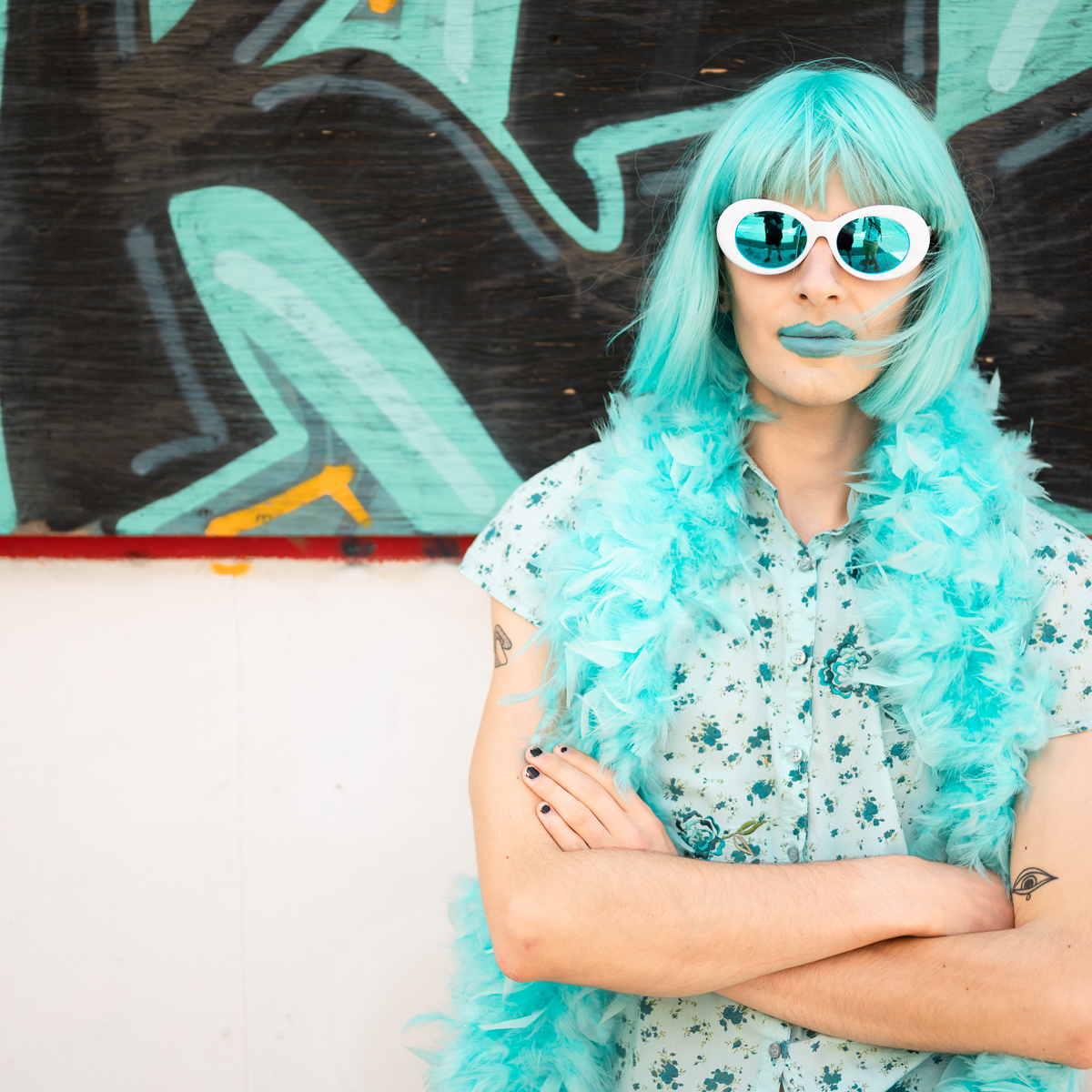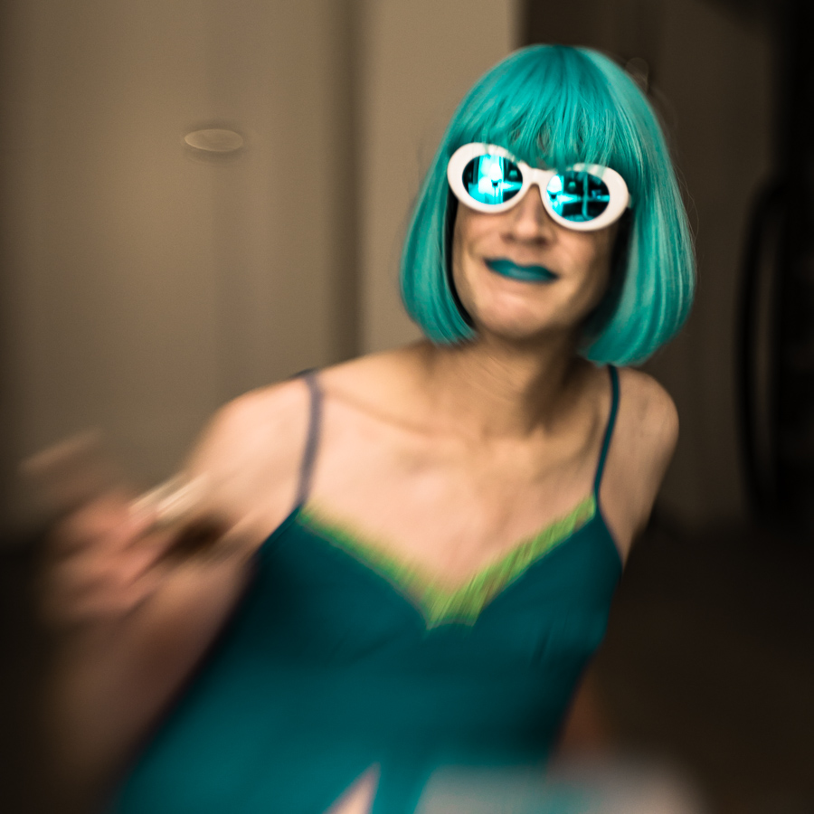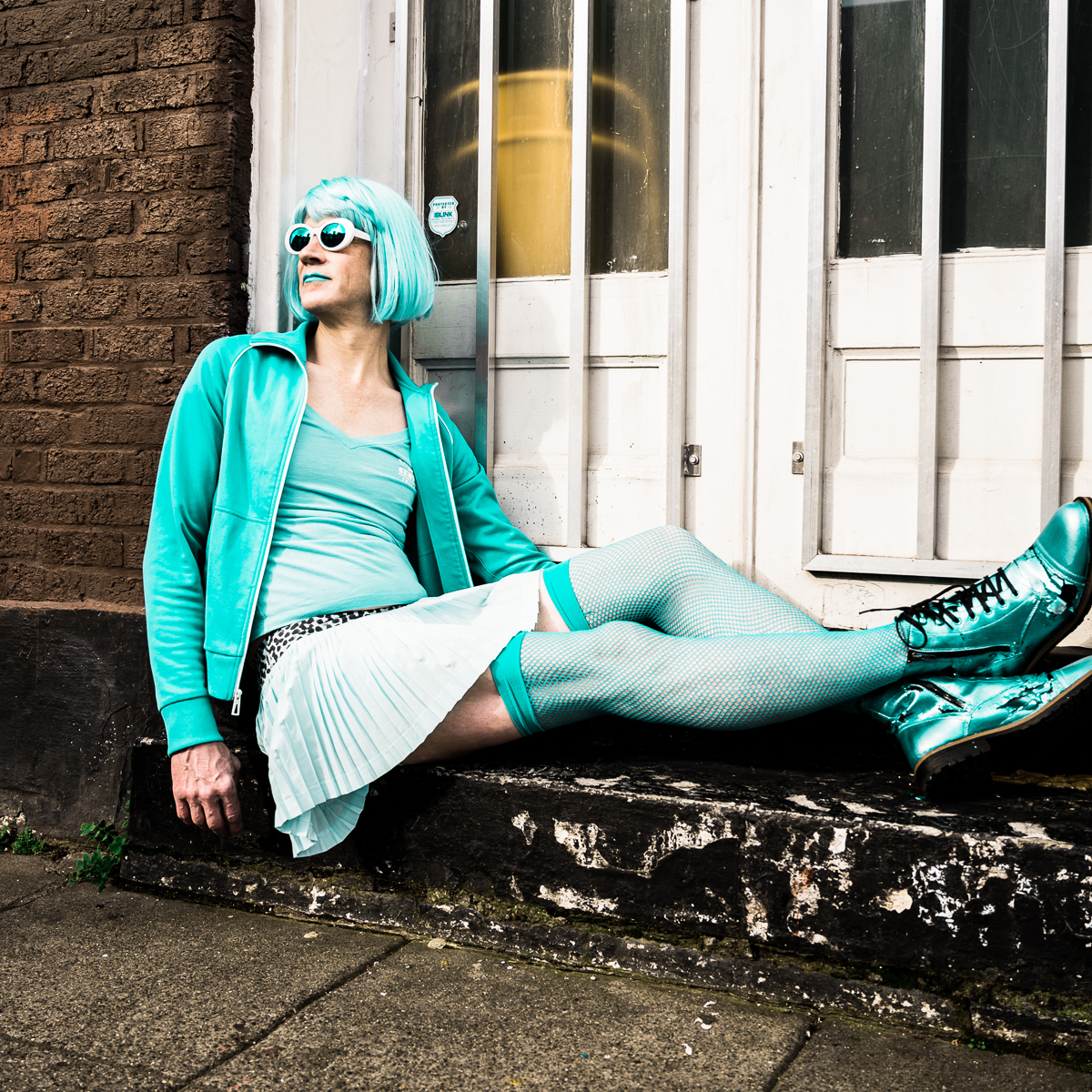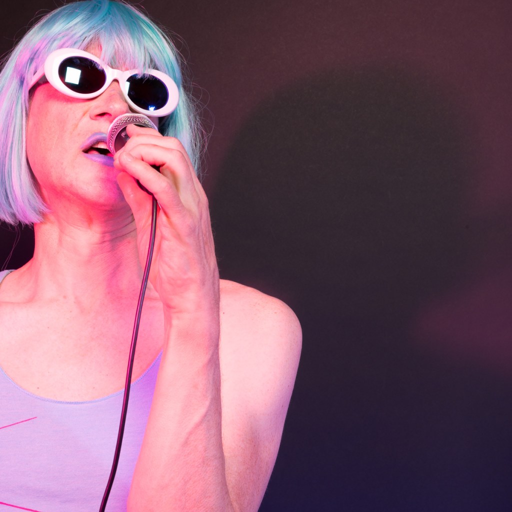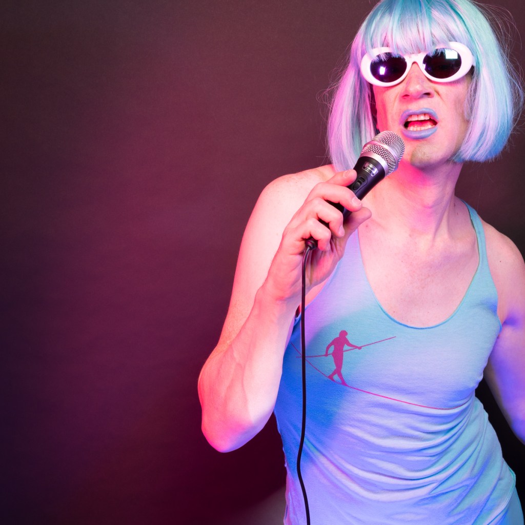 The Holly Terror Project revolves around a drag character I created in the ’90s. Holly is clad in aqua blue from the pageboy wig atop her head all the way down to her army boots. She draws inspiration from influences ranging from Andy Warhol’s Factory scene and the punk rock Riot Grrrls of the ‘90s to the broader queer culture.