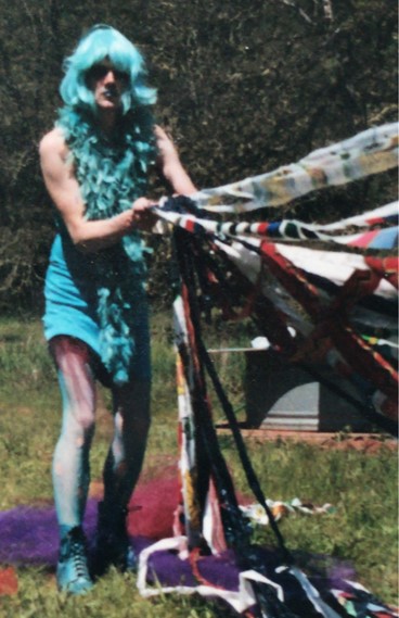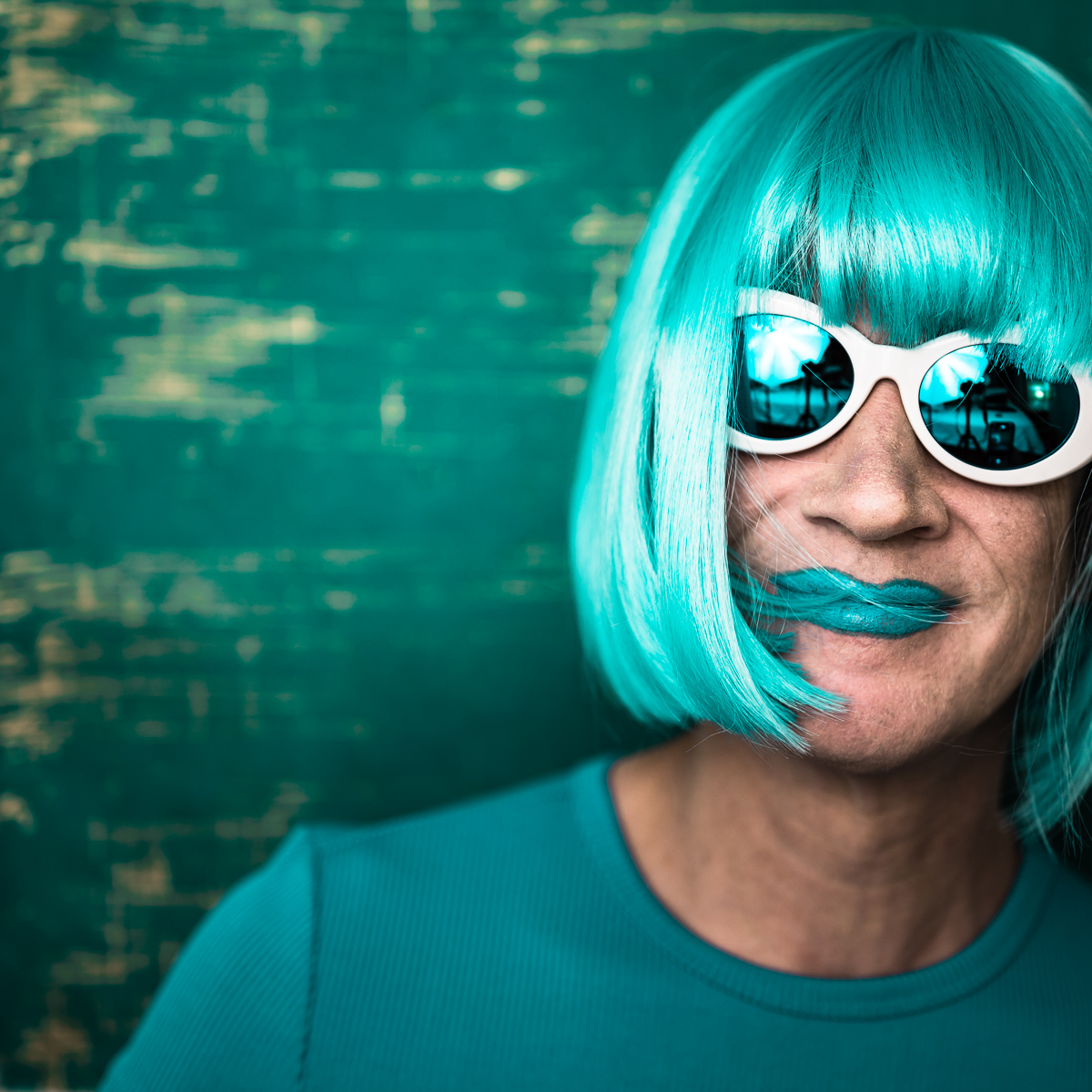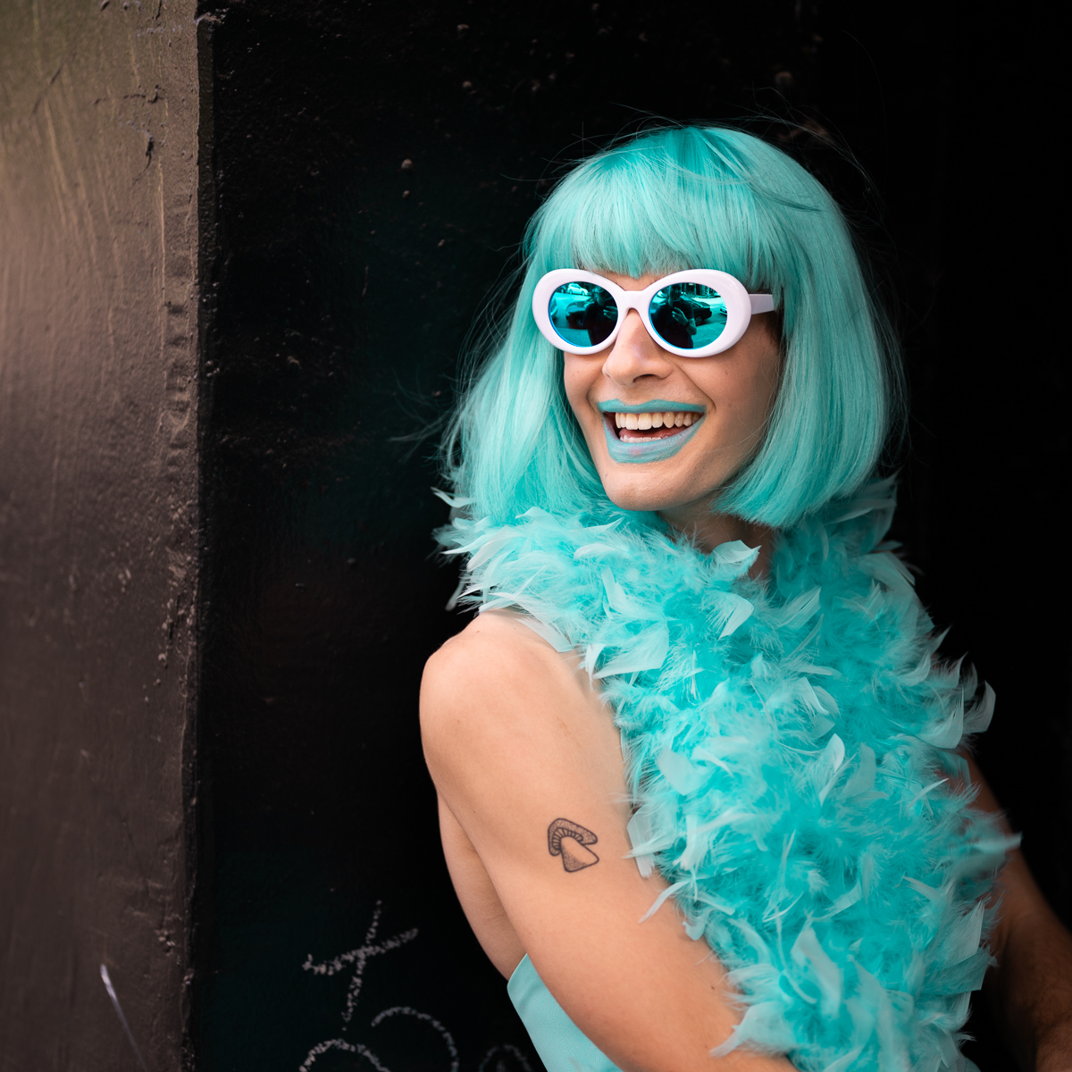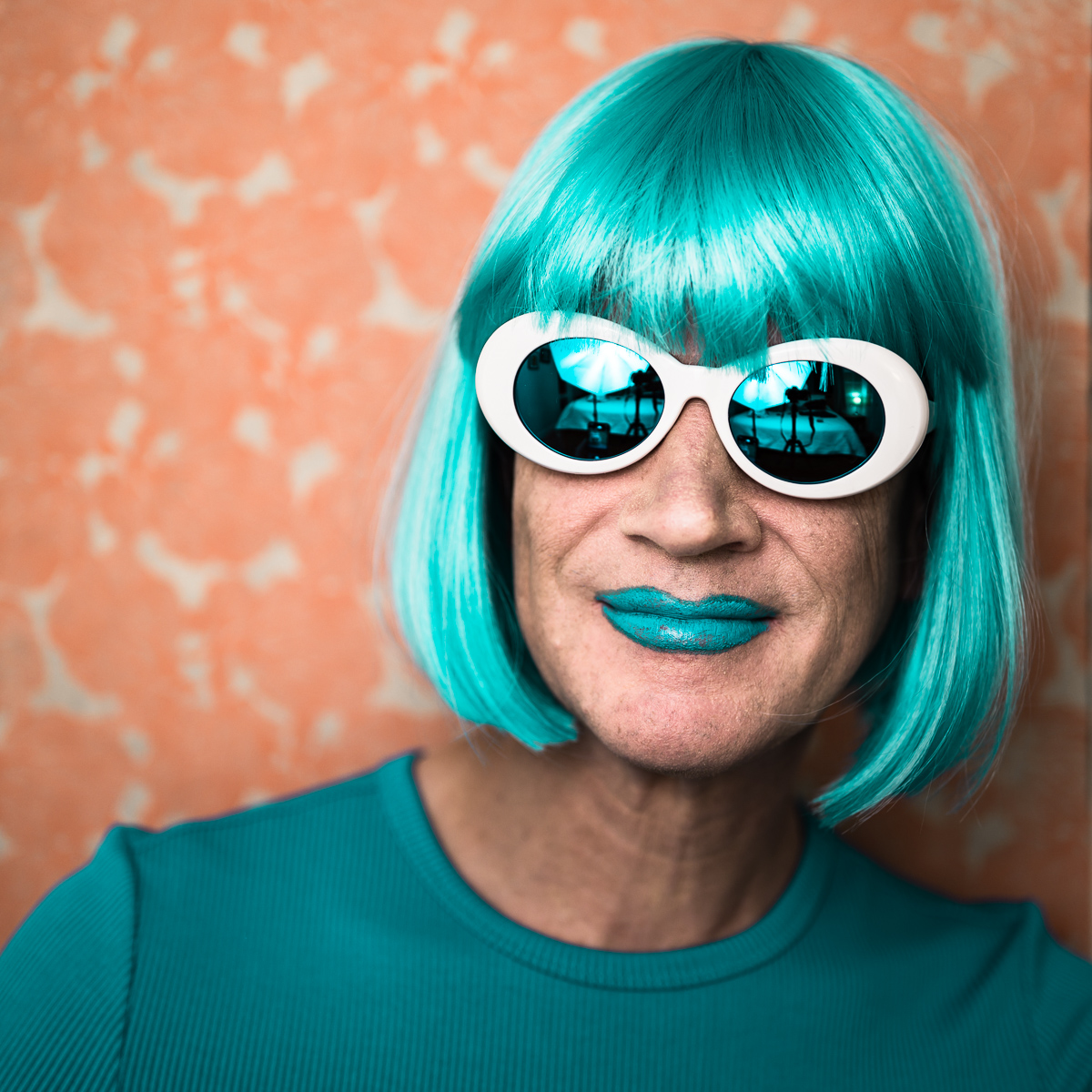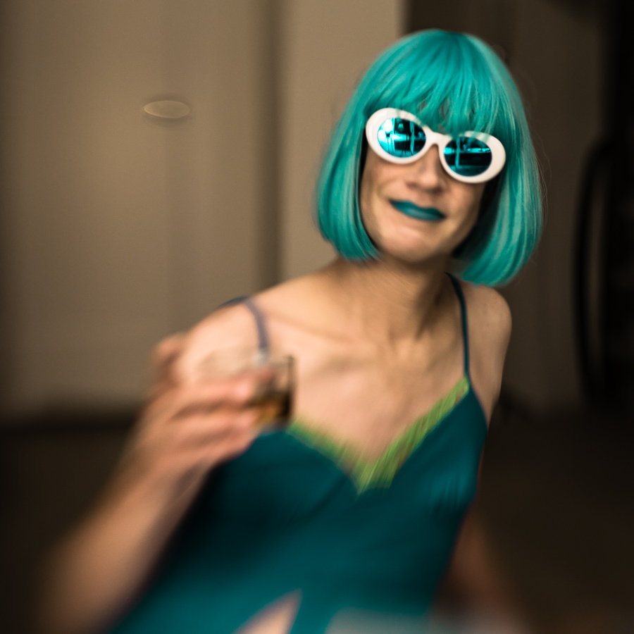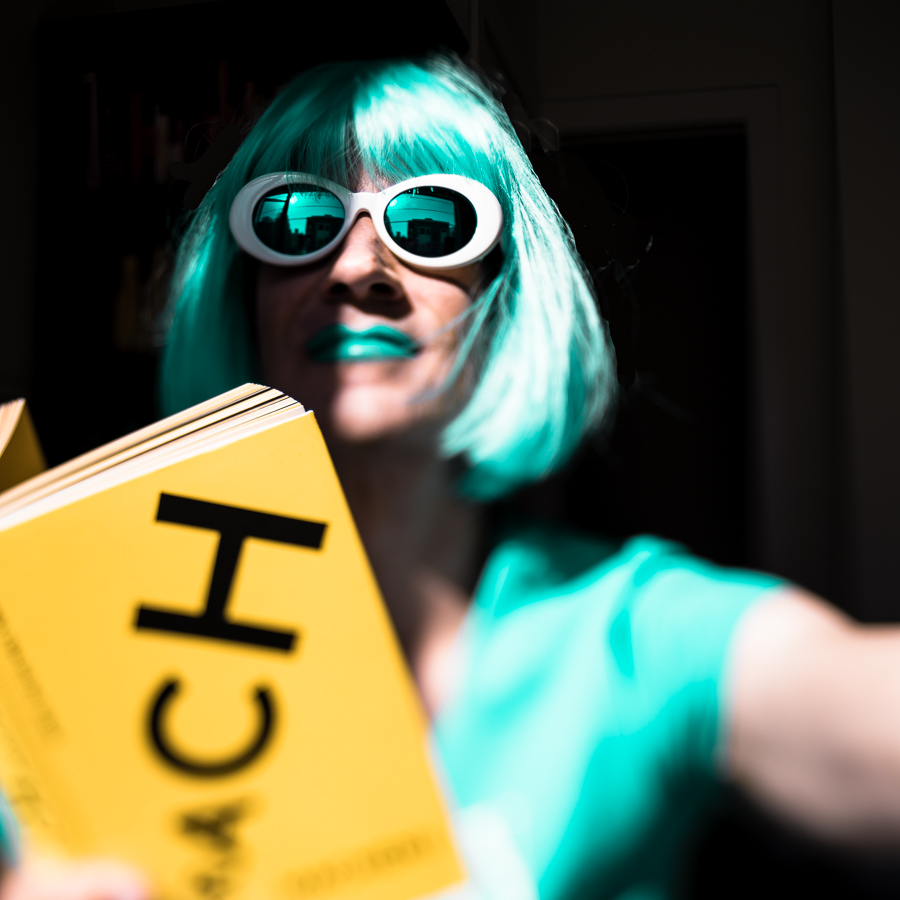The Holly Terror Project revolves around a drag character I created in the ’90s. Holly is clad in aqua blue from the pageboy wig atop her head all the way down to her army boots. She draws inspiration from influences ranging from Andy Warhol’s Factory scene and the punk rock Riot Grrrls of the ‘90s to the broader queer culture.